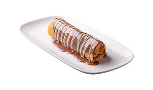 Mit Banane gefüllte Crêpe-Rolle, serviert mit Schokolade.