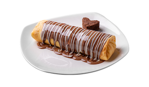 Gerollte Crêpe gefüllt mit Brownies, Banane, Erdbeeren und Frischkäse, garniert mit Schokolade