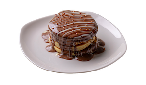 Vier Stücke Pancake mit drei Sorten Schokolade garniert