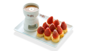 Mit Banane gefüllte Crêpe-Rollen, garniert mit Erdbeeren Mit Schokolade serviert