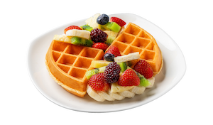 Waffel mit Früchten der Saison (serviert mit Schokolade).