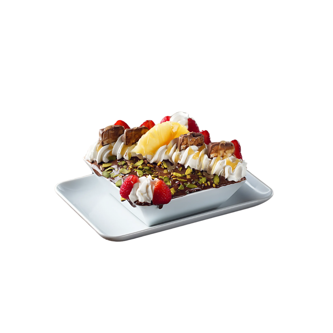 Banane, Erdbeere, Ananas, Kiwi, Creme, Nüsse, Karamell, Erdnuss & Schokolade
